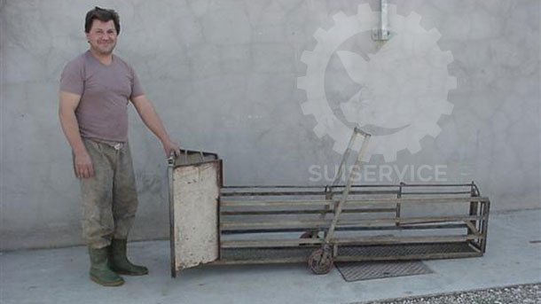 Si certains porcelets passent trop rapidement, une petite porte ralentit ou arrête le flux pour permettre la vaccination. Certains objecteront que la position de la personne qui tient la seringue est un peu gênante car elle doit s'accroupir, mais nous pouvons leur assurer qu'ils sont si rapides à vacciner une case de porcelets qu'il faut plus de temps pour déplacer l'engin d'une case à l'autre, ce qui est facile car il est équipé de roues bien pratiques.