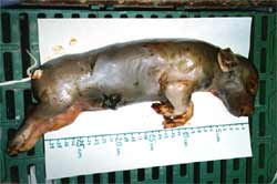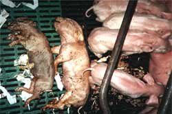 Parmi toutes les causes non infectieuses pouvant provoquer des problèmes de ce type, quoique toutes correspondaient à la situation de l'élevage, il faudrait souligner qu'à aucun moment la taille des portées ne démontra que les primipares étaient plus particulièrement affectées. En dehors du fait qu'il y ait eu une augmentation de l'effectif en Mars-Avril, tous les facteurs de risque se répètent chaque année sans que le pourcentage de momifiés n'ait jamais atteint le niveau actuel. De plus la taille des momifiés éliminait (théoriquement) le fait que l'origine du problème soit due à la conduite d'élevage.