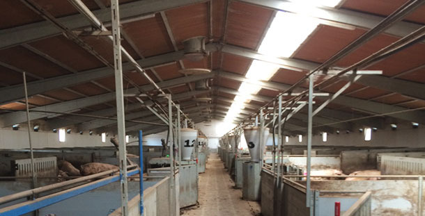 Salle de mise bas avec installation transversale de la partie translucide. L'illumination est bonne, mais moins homogène que lorsque l'installation de la partie translucide est longitudinale.