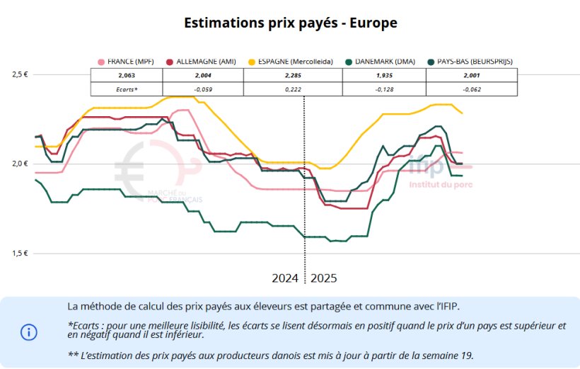 En Espagne, la tendance se confirme avec une nouvelle baisse de 1,7 centime. Le recul des prix du porc dans le nord de l’Europe en est la principale cause. Une majorité d’abatteurs espagnols ont réduit leur activité à quatre jours par semaine. Les achats de porcelets sous contrat se poursuivent, mais l’Espagne n’achète plus de porcelets sur le marché libre. Le poids moyen reste inférieur de 2,5 kg à celui de 2024 pour la même période, malgré une hausse de 5 % des abattages en 2025. Il est inhabituel d’observer une baisse des prix en juillet en Espagne, compte tenu de la faiblesse de l’offre et des poids. La situation actuelle est donc très exceptionnelle, liée au contexte dégradé du marché de la viande en Europe. Cela engendre de fortes tensions sur la compétitivité des abattoirs espagnols, et de nouvelles baisses de prix sont probablement à prévoir.