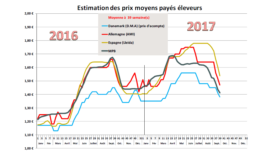 Le marché belge est également sous pression où une demande moindre se traduit par des concessions sur les pièces et des poids en hausse ; le cours recule de 4 cents. Le cours autrichien, sous forte influence allemande, perd 5 cents malgré des offres inférieures de 2% à l’an passé. Le prix d’acompte danois recule de 4 cents.