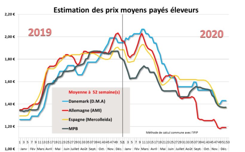 L’année 2020 aura été catastrophique pour la production allemande, déjà en repli depuis 3 ans. Comme ailleurs, le prix s’est parfaitement tenu durant les 3 premiers mois, culminant à plus de 2 euros/kg fin février / début mars. En juillet, la catastrophe a pris des proportions gigantesques avec la fermeture pendant 4 semaines de l'abattoir Tönnies à Rheda-Wiedenbrück. Le cours a perdu 55 centimes en 18 semaines (de la semaine 10 à la semaine 36). L’apparition de la Fièvre Porcine Africaine sur des sangliers en Allemagne de l’Est au mois de septembre a fini d’achever une filière déjà fortement ébranlée puisque les grands marchés asiatiques ont immédiatement fermé leurs portes. La baisse de la référence allemande s’est poursuivie pour se poser à 1,19 euro en fin d’année. Le bilan annuel du prix allemand est une baisse d’environ 9,25% / 2019. L’année 2021 démarre avec un retard d’abattage proche du million de porcs.