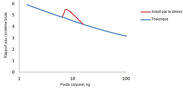 Figure 1 : Rapport eau/protéine chez le porc de la naissance jusqu’à la finition (l’axe est une échelle logarithmique (modifié à partir de Emmans et al., 1995) et la déviation qui se produit après le sevrage (démontré par exemple par Shields et al., 1983)