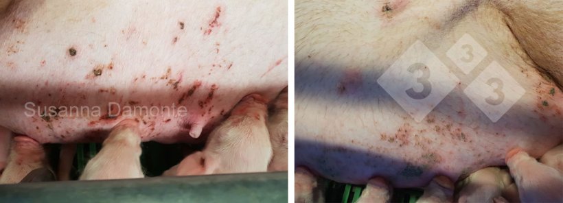 La première hypothèse diagnostique était liée à des causes mécaniques et environnementales, suggérant l'apparition de plaies compliquées par des agents pathogènes ; les animaux ont ensuite été surveillés pour rechercher des preuves supplémentaires. Parallèlement, l'utilisation de poudres desséchantes lors de la mise-bas a été introduite.