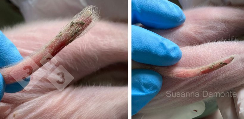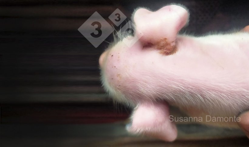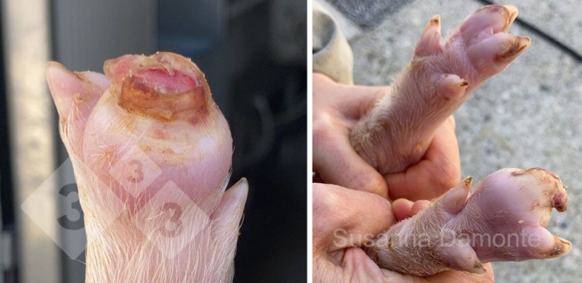 En mars 2021, un pourcentage élevé de boiteries sévères est apparu chez des porcelets de 12/17 jours - environ 20 % des animaux - avec une atteinte prédominante de la partie distale du membre, un œdème sévère de la bande coronaire et de la sole et, dans certains cas, étendu à l'ensemble du sabot : ils ont été traités avec des antibiotiques (amoxicilline) et un spray topique de chlortétracycline avec une bonne réponse et une rémission de l'infection. Cependant, dans des cas spécifiques, les tissus étaient tellement compromis qu'ils ont causé la perte du sabot.