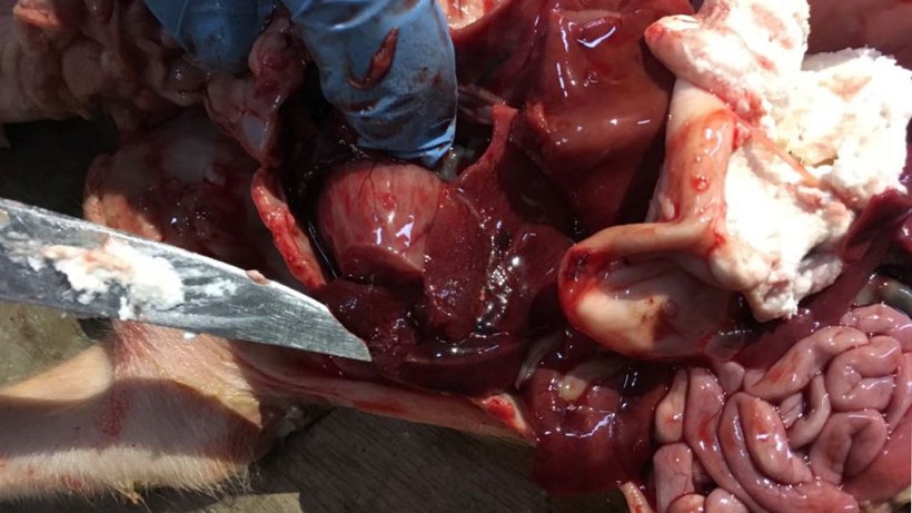 Lors d'une visite de l'élevage en avril 2018, 17 porcelets morts d'environ 4 jours provenant de différentes portées ont été observés. Tous les porcelets morts avaient un bon état corporel, mais ils étaient pâles (figure 1). Des autopsies ont été effectuées sur cinq porcelets morts. L'examen post mortem a montré un hémopéritoine causé par une rupture hépatique chez les cinq porcelets. Les estomacs étaient pleins de lait coagulé (figures 2 et 3). Des lésions musculaires ont été observées autour du site d'injection du fer dextran, avec un œdème et une décoloration noire brunâtre (figure 4).