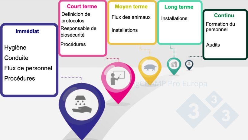 Supposons qu'après avoir audité un élevage, nous trouvions 15 aspects qui peuvent être améliorés (il y a souvent des risques que nous ne pouvons pas éviter, comme le fait d'être situé dans une zone à forte densité d'élevage). L'organisation du plan doit être équilibrée entre le risque potentiel encouru et le temps nécessaire pour traiter ces questions. Ainsi, les objectifs sont organisés de manière temporelle (figure 1) :