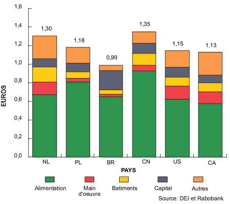 Le Dutch Agricultural Economics Institute et la Rabobank ont conduit une étude comparative des coûts entre différents pays, Hollande (NL), Pologne (PL), Brésil (BR), Chine (CN), U.S.A. (US) et Canada (CA). Le plus faible coût est au Brésil, avec 0,99 €/kilo de carcasse, grâce à sa production interne d'aliment, au faible prix de la terre, à la main d'œuvre à bas prix et à un climat favorable.