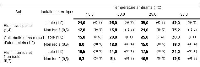 Le tableau 1 nous présente les variations de la température effective en fonction de différents paramètres. La température effective peut se définir comme étant la sensation réelle de chaleur (ou de froid) perçue par un animal.