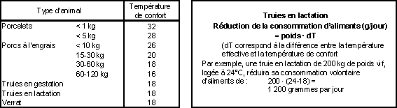 La production laitière de truies conduites dans une maternité à 30°C et alimentées à volonté a été significativement inférieure à celle de truies alimentées sur le même niveau de rationnement, mais dans une ambiance 20°C (JRP 97). Au sevrage à 3 semaines, la croissance des portées à 30°C était inférieure de 20%!