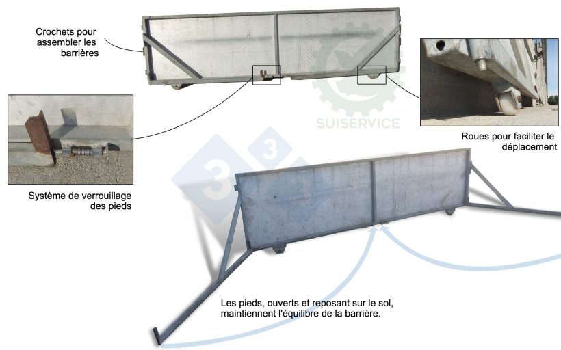 - Elle est conçue pour être reliée à d'autres barrières similaires afin d'établir un long mur de clôture entre deux bâtiments.