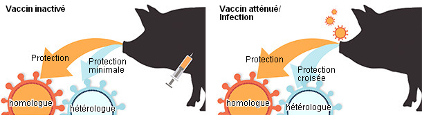 Il est peu probable que les anticorps stimulés par les vaccins inactivés ou ceux transférés passivement offrent une protection croisée complète contre l'infection avec un virus différent, ce qui entraîne un échec vaccinal et augmente les frais pour les producteurs. L'échec vaccinal peut se compliquer davantage si le vaccin induit des anticorps de réaction croisée face à une HA du même sous-type empêchant la neutralisation d'une infection ultérieure (c'est à dire, sans réactivité croisée dans le test HI), ce qui peut résulter dans une maladie respiratoire aggravée associée au vaccin (VAERD) ; (Gauger et al., 2011). Pour que cette maladie respiratoire aggravée se manifeste, il faut la non concordance entre les HA et les NA des virus du vaccin et du virus de l'infection. Ces VAERD ont été prouvées dans plusieurs scénarios expérimentaux, et il y a des indices de leur existence sur le terrain.