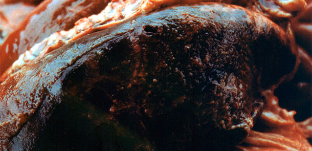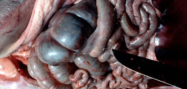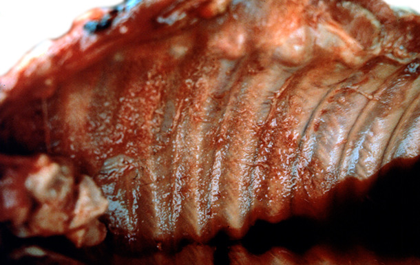 21 des porcs morts ont montré un tableau pathologique semblable. Tous présentaient des quantités variables de sang mousseux qui sortait des orifices nasaux, ils avaient la gueule ouverte et de l’hyperhémie sur la partie ventrale du thorax et de l’abdomen. Tous avaient une bonne condition et avaient 15 ou 16 semaines d’âge.