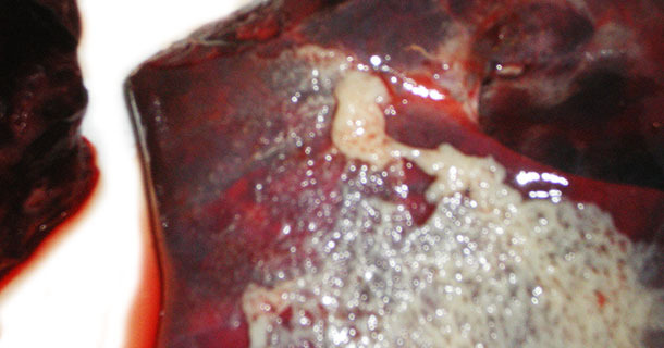 Après 2 mois d’épisode d’App les poids d’abattage avaient chuté de 5 kg/porc et l’abattoir s’est plaint du nombre élevé de pleurésie. L’inspection à l’abattoir a confirmé la pleurésie sur 75% des carcasses et des lésions chroniques d’App sur 50% (figures 7 et 8).