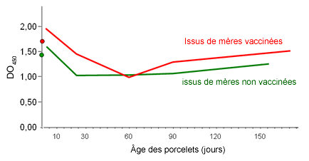 Les vaccins peuvent être administrés aux porcelets ou aux mères. La vaccination des mères garantit une augmentation du niveau des anticorps transmis aux porcelets (figure 1) alors que la vaccination des porcelets, bien qu'elle soit plus laborieuse, apporte une immunité d'une plus longue durée.