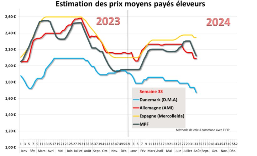 Le prix du porc poursuit sa baisse maximum au Marché du Porc Français. Le cours s’établit ainsi le mercredi 14 août sous la barre des 2 euros à 1,952 euro. La présence du férié du 15 août a donné peu de possibilité aux groupements vendeurs de s’opposer à la baisse malgré la petitesse de l’offre. En effet, sur la zone Uniporc, les abattages de cette semaine d’activité écourtée ne se sont élevés qu’à 285 265 porcs, soit 10 360 de moins (- 3,5%) que la même semaine 2023. Depuis la semaine 01, les abattages de la zone Uniporc, pour un même nombre de jours d’activité, sont en retrait de près de 193 000 porcs (- 1,7%) ou une baisse hebdomadaire de 5 850 porcs