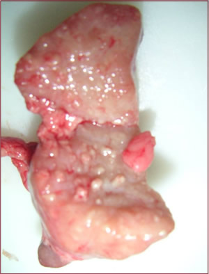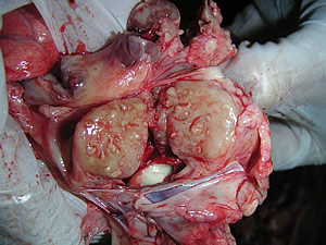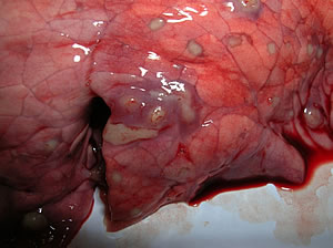 Les lésions peuvent être des nodules caséeux plus ou moins en kystes au niveau des poumons (mycobacteruim bovis) et (ou) lésions caséeuses ou caséo-calcaires au niveau des ganglions mésentériques (mycobacterium avium).