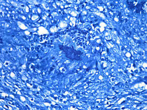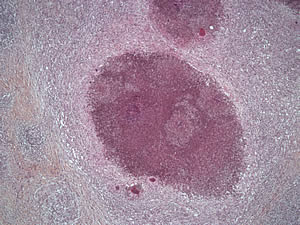 Présence de multiples granulomes avec souvent un amas de polynucléaires et éosinophiles nécrosés en leur centre. On observe en couronne des macrophages, cellules épithélioïdes et cellules mononuclées. En périphérie du ganglion, on observe des plages de polynucléaires éosinophiles segmentés ou non. Quelques points de minéralisation sont observés. Au centre, quelques granulomes, on observe un amas éosinophilie formant de petites massues.