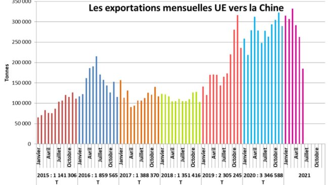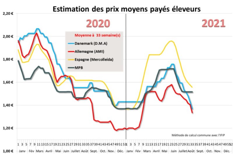 Au 4 août, le prix moyen en Chine est à 15,56 CNY pour un équivalent de 2,04 euro le kilo vif, 57,9% sous la même référence 2020 et 16% sous la référence 2019.