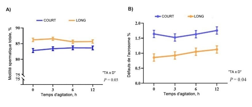 Dans une autre étude, celle de Tamanini et al. (2022), évaluant l'effet du temps d'exposition aux vibrations et l'influence du dilueur sur cette réponse, les auteurs ont simulé le transport par émission de vibrations induites par un agitateur à 70 rpm pendant 0 (pas de vibration), 3, 6 et 12 h avec des doses diluées dans des dilueurs de courte et de longue durée. Dans cette étude, il a été possible de vérifier que la motilité des spermatozoïdes et l'intégrité des acrosomes étaient influencées par l'interaction entre le temps d'agitation et le dilueur, démontrant un léger effet néfaste des vibrations sur ces paramètres (Figure 1).