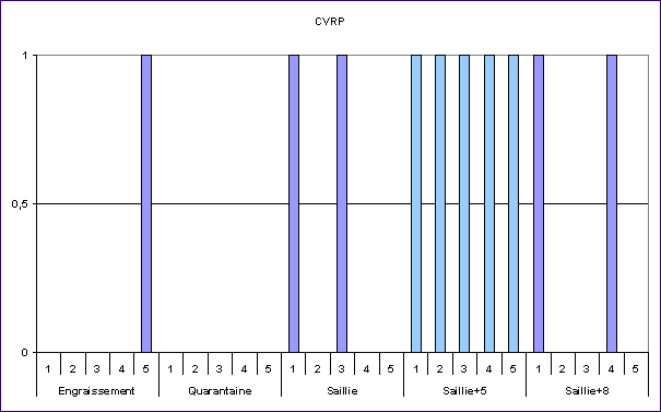 La seule chose remarquable a posteriori est un passage de SDRP identifié sur l’ensemble de l’élevage 3-4 mois auparavant donc sensiblement au moment des saillies de ces animaux. Cet épisode avait entraîné la mise en place d’un programme vaccinal sur le cheptel truie avec vaccin vivant.