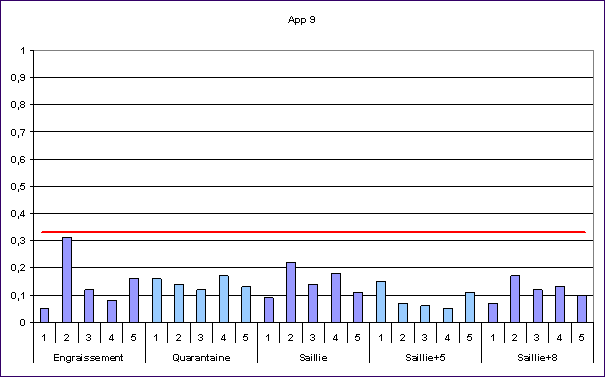 - Actinobacillus : pour le 9, tous les prélèvements sont négatifs. Par contre pour le 2 on voit très nettement un changement de statut entre la fin d’engraissement et 5 semaines après saillie.