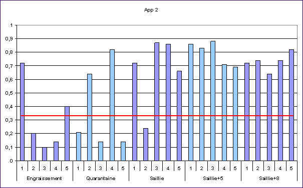 - Mycoplasme : Tout est positif en fin d’engraissement et 5 semaines après saillie. Par contre on a un statut variable, négatif, douteux ou positif sur les animaux en fin de quarantaine ou à la saillie.