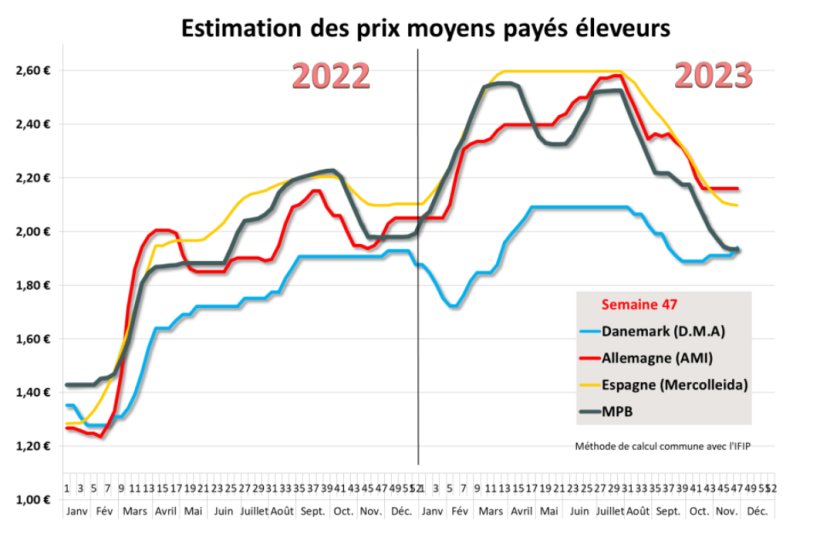 Après une légère baisse de 0,2 cent le lundi 20 novembre, le prix du porc s’est stabilisé à 1,763 euro au Marché du Porc Breton après 7 semaines de baisse ininterrompue et 24 centimes perdus par rapport à la référence du 5 octobre. La demande des abattoirs se renforce et se traduit au marché au cadran par une amplitude de prix réduite à 0,3 cent avec des positions à l’achat des entreprises finalement très homogènes. D’autre part, quelques 1 100 porcs ont pu être refusés à la vente pour enchères insuffisantes. Les abattages de la semaine dernière se sont élevés à 362 870 porcs, les poids évoluent assez peu à 96,41 kg (-36 g). Les reports d’abattage issus du fériés du 1er novembre et des perturbations liées à la tempête Ciaran semblent en voie de résorption. Le marché français s’anime également pour satisfaire les commandes liées aux festivités de la fin d’année avant le traditionnel ralentissement aux environs de la semaine 50.