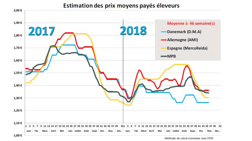 L’évolution du prix en France est assez proche de la stabilité à 1,170 euro (- 0,1 cent). Le déroulement des séances de vente laisse toutefois comprendre que les offres suffisent aux besoins des abattoirs qui ont laissé près de 14% des offres présentées sans enchère, ces lots leur étant en partie affectés en fin de séance et bénéficiant d’un jour supplémentaire d’enlèvement. L’activité dans la zone Uniporc s’élève à 381 554 porcs abattus et fait suite à une activité précédente record pour ce second semestre 2018 (384 444). Pour autant, les poids continuent leur progression puisqu’après les 700 g de la semaine 45, les poids moyens de la dernière semaine s’accroissent de 65 g pour s’établir à 95,64 kilos, très proches à présent de leur équivalent 2017. Les retards dans les enlèvements liés au férié du 1er novembre expliquent l’augmentation des poids mais aussi le climat doux, l’absence de problèmes sanitaires et une alimentation actuelle particulièrement riche en protéines.
