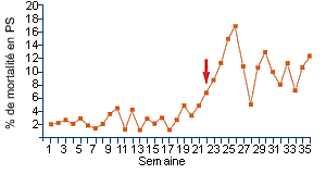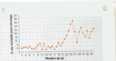 Exemple de l’évolution du taux de mortalité en post-sevrage dans un élevage où la MAP doit être suspectée.