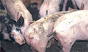 Porcs de 2 (à gauche) et 3 mois (à droite) atteints de MAP. Notez l'épine dorsale marquée, signe de retard de croissance.