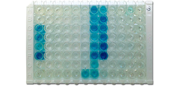 Figure 4 : photographie d’une plaque IDEXX ELISA X3 qui montre des résultats positifs (couleur bleue) et négatifs (incolore). La densité de couleur est en relation avec le niveau d’anticorps du sang, c’est-à-dire, plus la couleur est sombre, plus le titre d’anticorps est élevé., es decir, cuanto más oscuro es el color, más alto es el título de anticuerpos.