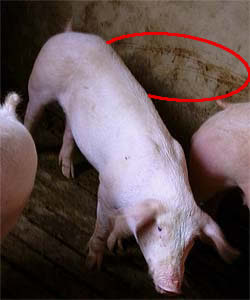 Dans ces 4 autres bâtiments on n'observe aucun symptôme pendant au moins les 2-3 semaines suivant l'apparition des troubles. Mais, après un moment, dans l'un des bâtiments (où les animaux ont entre 50 et 60 kg) un foyer de diarrhée avec sang commence dans une salle.