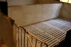 grillages, les trémies, ... • Les fosses sont nettoyées et désinfectées en levant les grilles pour avoir un meilleur accès. • Une fois le bâtiment séché, le sol et les murs sont passés à la chaux jusqu'au niveau où les animaux peuvent accéder. • Le bâtiment est laissé vide 2 semaines. |