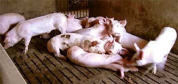 en 5 bâtiments d'une capacité de 350 à 450 porcs chacun. • L'engraissement est rempli avec des porcelets provenant d'un élevage qui fonctionne en bandes toutes les 3 semaines, avec un objectif de 40 mise-bas / 3 semaines. Les porcelets sont sevrés à 28 jours et quittent l'élevage à 9 semaines d'âge. Il arrive ainsi 400 porcelets toutes les 3 semaines. • Les bâtiments ont un couloir central avec des cases de chaque côté d'une capacité d'environ 18 porcs. |