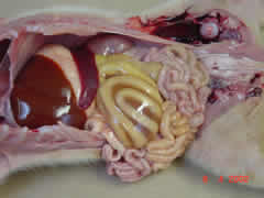 Nous observons une bande ayant mis bas depuis 4 jours. Les truies n'ont présenté aucun signe pathologique. Environ 40% des porcelets présentent de la diarrhée. Celle-ci est assez liquide de couleur jaunâtre. Les porcelets sont " défaits " (perte d'état d'environ 50% par rapport aux sujets sains). Il n'y a pas eu de prise de température rectale sur les porcelets malades.