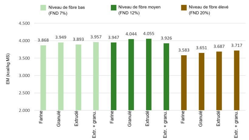 Figure 1: Effets des niveaux de fibre et du traitement technologique sur la valeur de l'énergie métabolisable (EM), en kcal/kg MS (Rojas et al, 2016)