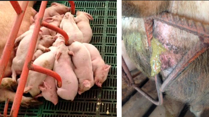 Des diarrhées et des vomissements ont été observés chez les porcelets avant le sevrage (photo 2) en septembre 2014 (semaine 38) ; 4 jours après les premiers cas, le pourcentage de diarrhée chez les porcelets de première semaine a augmenté, la diarrhée et les vomissements étaient également présents (photo 2) chez les truies en gestation et en maternité, atteignant environ 20% de prévalence.