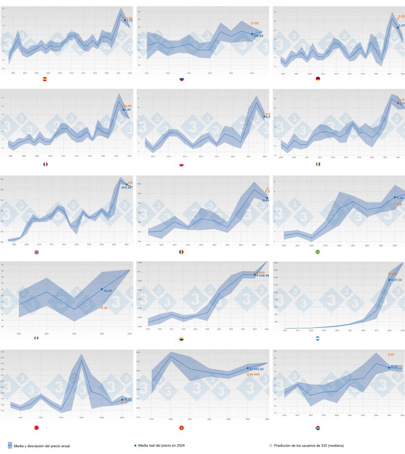 Le graphique 1 présente la comparaison entre les prévisions de prix fournies par les utilisateurs de 333 et la moyenne du prix réel pour l’exercice 2024 dans chacun des pays analysés, ainsi que le nombre de données utilisées dans l’analyse. Quant à la figure 1, elle illustre les mêmes informations, accompagnées de l’évolution du prix moyen au cours des dernières années.
