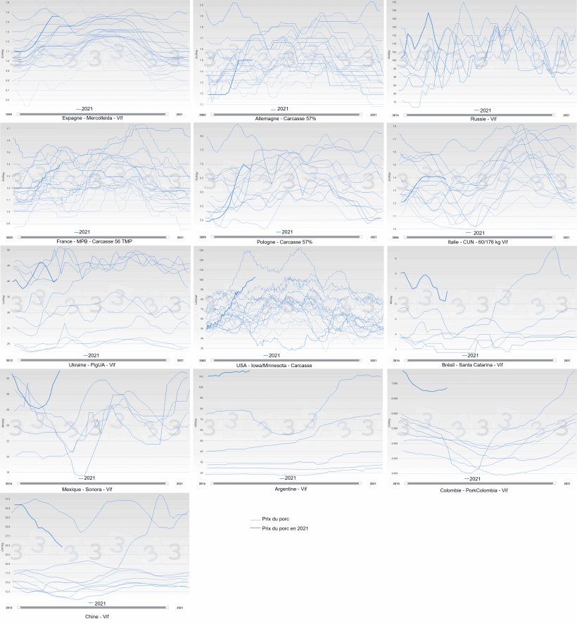 Figure 2. Évolution annuelle du prix du porc par pays (bleu). La ligne épaisse représente le prix en 2021.
