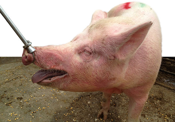 On a détecté un érythème multiforme (EM) sur la plupart (90%) des truies, associé avec des problèmes respiratoires et sans mortalité. Depuis janvier 2014 jusqu’à notre visite clinique en mai 2014, quand on transférait les truies vers les cases où elles étaient logées en groupe (environ 30-35 jours de gestation), elles développaient un EM caractérisé par des zones cutanées surélevées et rouges réparties sur tout le corps, particulièrement sur le cou, la face et autour des yeux et des oreilles (figures 1-3). De plus, les truies malades présentaient de la dépression, de l’anorexie, une fièvre élevée pendant 1 à 3 jours (40-41,5°C), des difficultés posturales et des signes respiratoires (difficultés respiratoires modérées, écoulements oculaires et nasaux avec du mucus et du sang, figures 4-5). Ces symptômes n’apparaissaient pas sur les truies allaitantes ni sur les truies récemment sevrées ou dans le bâtiment des nullipares de renouvellement qui n’avaient pas encore été inséminées. Les signes cliniques étaient évidents et duraient plusieurs semaines sur la plupart des truies gestantes une fois mélangées dans les cases (environ 90%) ainsi que sur les truies et les nullipares du noyau des grand-parentales. D’autre part, 10 à 15% des truies et des nullipares avaient des retours juste après leur mélange dans les cases (tableau 2).