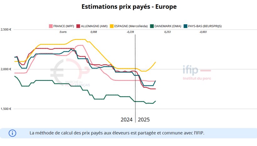 L’Espagne, pour sa part, bénéficie toujours d’un contexte très favorable et la tendance haussière se poursuit. L’offre demeure largement inférieure à la demande, cette dernière étant partiellement compensée par d'importantes importations de porcs vifs et de porcelets. Pour l’instant, les cours de la viande sur le marché espagnol restent stables. À l’export, si les poitrines se vendent très bien, les jambons sont proposés à bas prix et les longes rencontrent des difficultés à trouver preneur. Si le marché de la viande ne progresse pas, les marges des abatteurs pourraient se retrouver fortement réduites d’ici quelques semaines. En attendant, la dynamique de l’Espagne semble stimuler l’ensemble du marché européen.