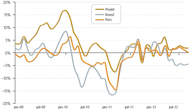 Ces données positives se justifient par la bonne évolution de l'export au cours des derniers mois, contrastant avec la platitude de la demande intérieure. Le graphique 3 reflète la consomation par types de viande entre janvier 2012 et décembre 2012.