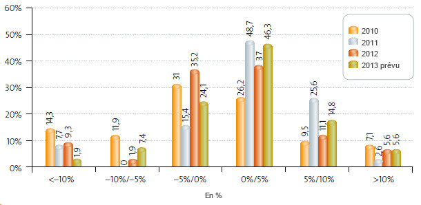 Malgré l'augmentation de la production, les prix ont aussi été élevés l'an passé. Sur le graphique 2, on peut voir les oinions des entreprises du secteur sur les ventes en 2012 et leurs pespectives 2013.