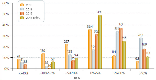 Il faut souligner que les ventes se sont améliorées en 2012 pour 87% des enquêtés, alors que 57% dit avoir augmenté ses ventes de plus de 5% (10% avec des augmentations supérieures à 10%).