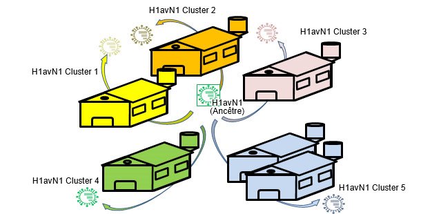 Figure 1. Ancêtre commun H1huN2 (1994) ; Isolement géographique → la dérive produit des variantes liées à chaque pays.