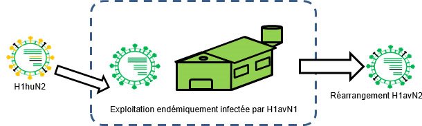 Figure 2. H1huN2 est transmis dans une exploitation infectée endémiquement par H1avN1 → un réarrangement a lieu.