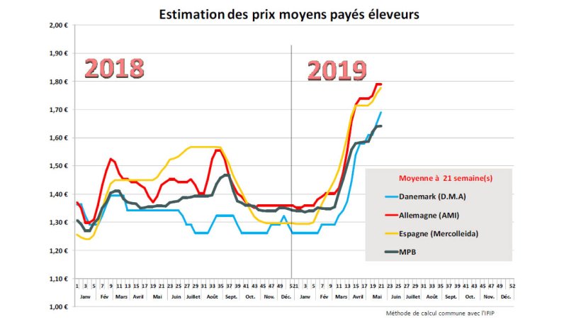 En Espagne, l’activité reste forte pour anticiper les futures hausses du prix du porc. Cependant, la hausse du cours est restée limitée à 1,6 cent, car la référence espagnole doit préserver sa compétitivité à l’export. Malgré tout, le rapport offre/demande est déséquilibré par une offre plus faible qu’escomptée, en témoigne le cheptel des porcelets en diminution depuis plusieurs mois en raison de problèmes sanitaires, cheptel qui ne devrait pas se redresser au cours de cette année 2019. Sur le marché de la viande, les hausses du prix du porc sont difficiles à être répercutées et malgré un commerce florissant à l’export, il manque malgré tout, ici aussi, l’impulsion nécessaire en provenance du marché intérieur pour un redressement sensible du cours du porc.