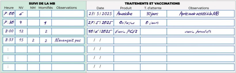 Les traitements et les vaccins doivent être consignés afin de vérifier qu'ils ont bien été effectués à la date prévue et de contrôler strictement le délai d'attente des médicaments (le nombre de jours qui doivent s'écouler entre l'administration d'un produit et la commercialisation de l'animal).