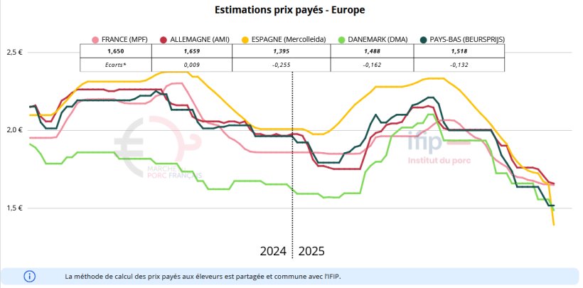 En Espagne, le foyer de FPA détecté près de Barcelone compte désormais neuf sangliers positifs dans la zone concernée. Jusqu’à mardi dernier, les exportations vers les pays tiers étaient suspendues dans l’attente de la mise en œuvre des mesures de régionalisation. Bien que les abattoirs de la zone touchée soient fortement dépendants des exportations, l’application progressive de ces accords devrait limiter l’impact pour les opérateurs espagnols et, par ricochet, pour le marché européen. Toutefois, la mise en œuvre prend du temps : certains pays importateurs demandent des informations supplémentaires, un délai difficilement compatible avec les capacités de stockage désormais saturées des abattoirs. Lundi 1er décembre, Mercolleida a exceptionnellement abaissé son prix de 10 centimes. La cotation habituelle du jeudi a suivi avec une nouvelle baisse de 10 centimes. Au total, le prix espagnol a reculé de 20 centimes sur la semaine 49. En résumé, la situation est sérieuse, mais l’optimisme demeure grâce aux accords de régionalisation, dont l’application complète prendra néanmoins un certain temps. Pour l’heure, avec les prix désormais les plus bas d’Europe, l’Espagne s’apprête à devenir particulièrement agressive sur les prix de la viande.